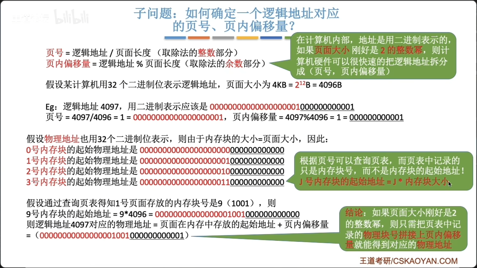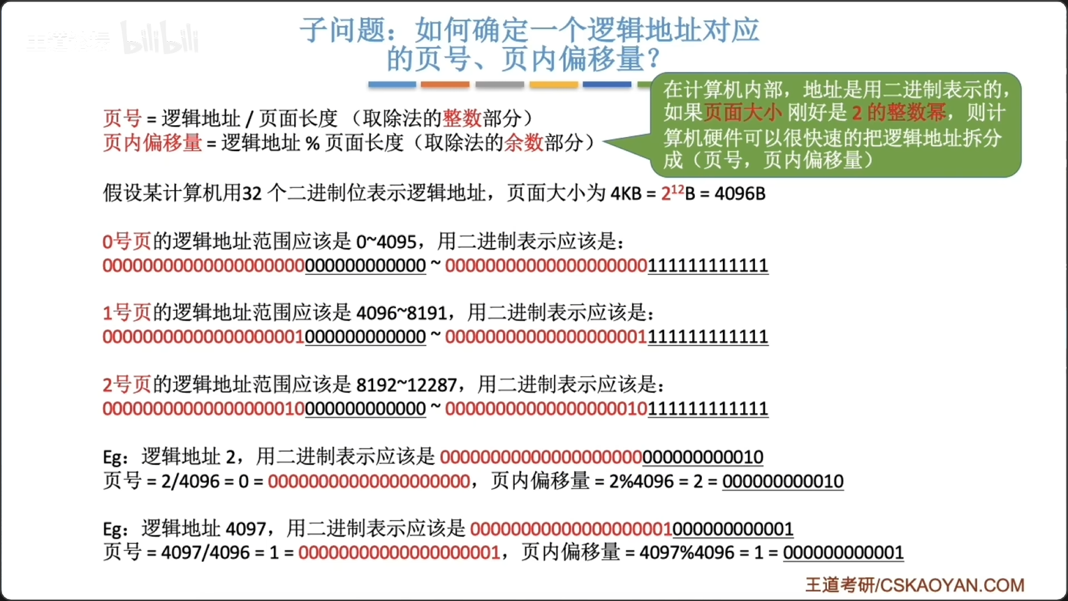 当页面大小是 2 的整数幂时,硬件可直接通过二进制位切分得到页号与页内偏移,从而无需除法运算: