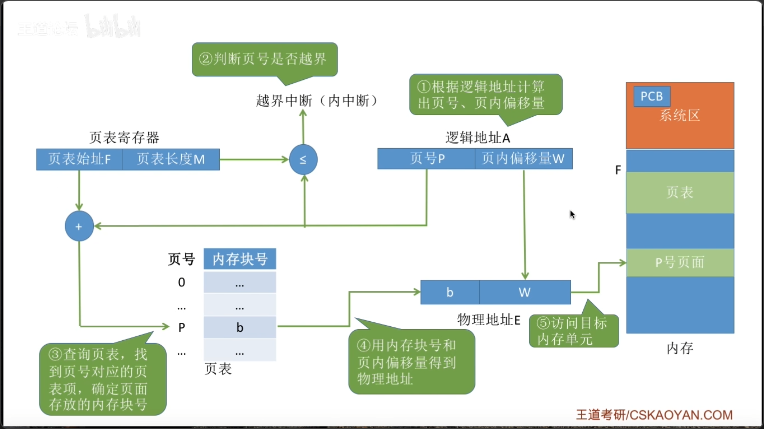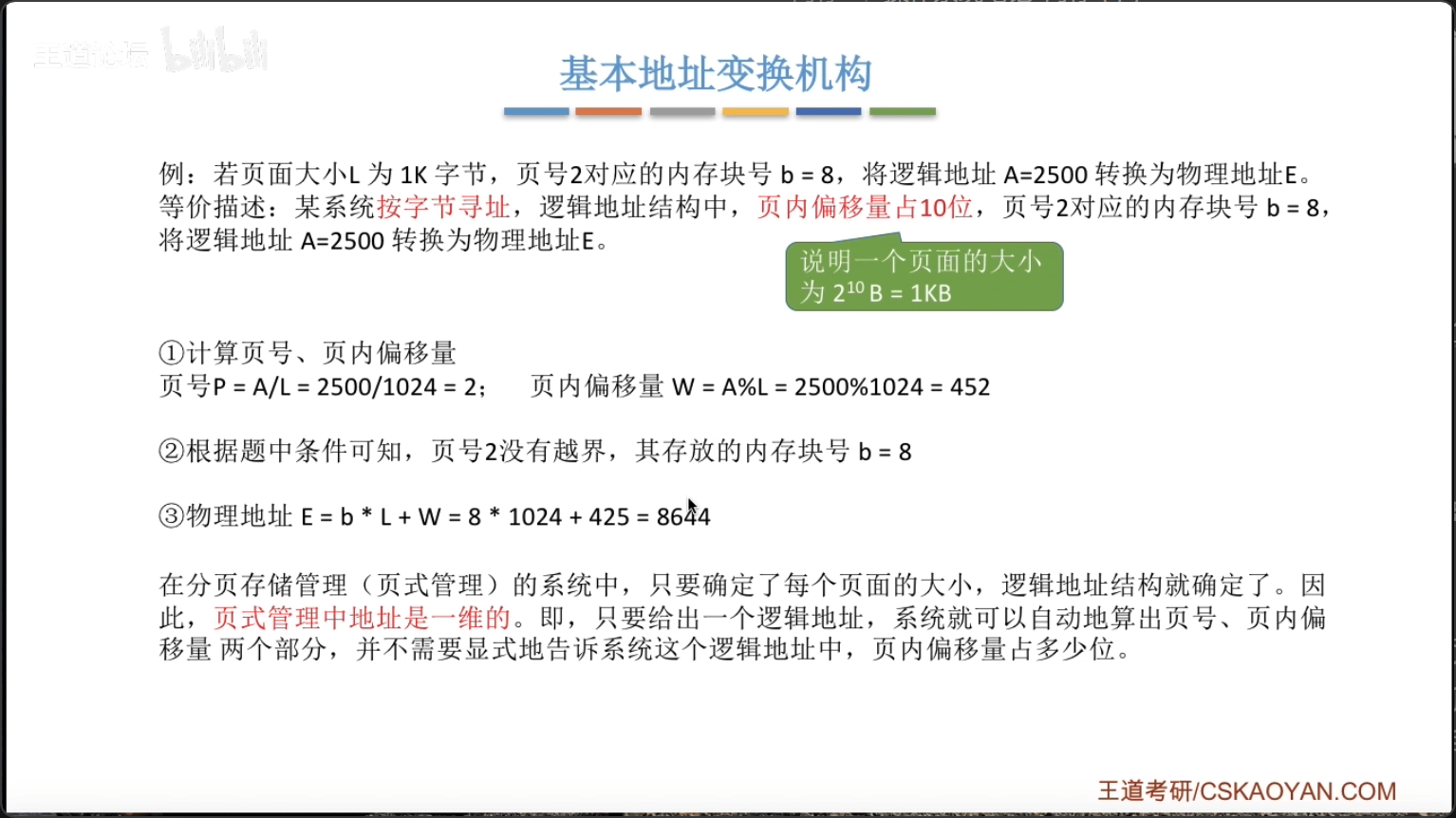 A对应的物理地址 =P号页面在内存中的起始地址 + 页内偏移量W